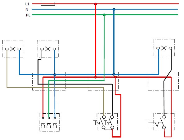 نبدأ من المصدر حيث عدد الاسلاك ثلاثة وهي تمثل الخط الحامي (L1) وهو مزود بمصهر الحماية الظاهر على شكل مستطيل والخط البارد او المحايد (N) وهو بلون الازرق (او اسود) اما خط الحماية الارضية (PE) فهو باللون الاخضر ونلاحظ ان الخط الحامي تم توصيله الى المفتاح المفرد والى المفتاح المزدوج على البرغي المشترك والمفتاح المزدوج هوعبارة عن (مفتاحين مفرديين) كما تم توصيل الخط الحامي الى الابريز (ويتم توصيلة على المكان المخطط له وغالبا ما يكتب عليه L1) اما الخط البارد فتم توصيله الى المصابيح ولا يجوز توصيله الى المفاتيح في حالة التوصيل الداخلي (داخل المنزل) وذلك من اجل اجراء الصيانة للمصابيح واستبدالها كما تم توصيل الخط البارد الى الابريز ويوصل على البرغي المخصص له ويكتب عليه ايضا (N) . كما تم توصيل الخط الارضي (PE) الى الابريز فقط وعلى البرغي المخصص له.